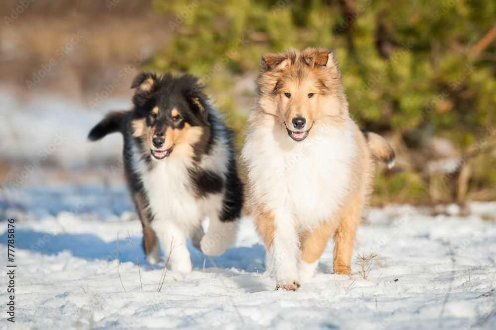 Two Rough Collie Puppies Running In Winter Stock Photo Adobe Stock